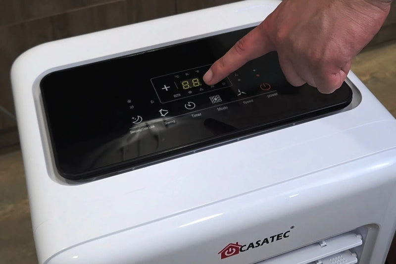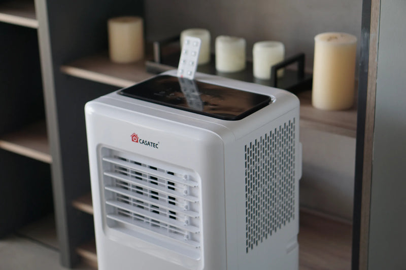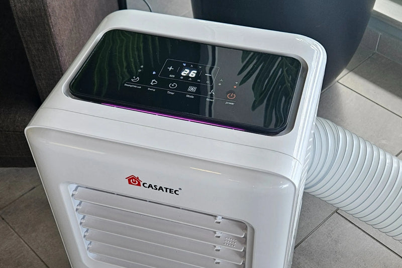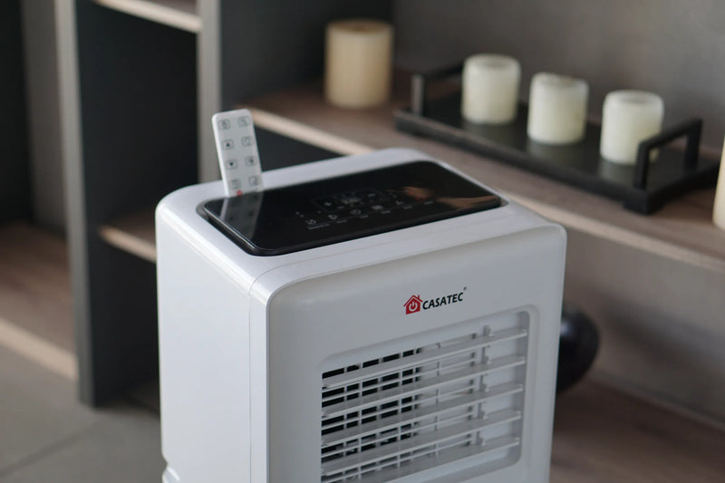 El aire acondicionado portátil 4 en 1 Casatec UltraDry 500 aspira el aire del ambiente y lo hace circular a través de una bobina que lo enfría o calienta, según el modo seleccionado. También puede deshumidificar hasta 24 litros al día, reduciendo la humedad y mejorando la calidad del aire. El aire tratado se devuelve a la habitación, mientras que el exceso de calor y humedad se expulsa al exterior a través de una manguera. Con controles digitales, temporizador y conectividad Wi-Fi, ofrece un control climático completo, práctico y eficiente para espacios de hasta 25 m².